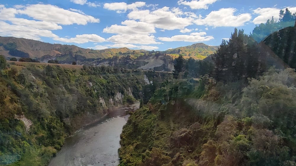 Journey begins rather flat and commonplace. Second stop is Hamilton; land gives way to lush forests and farmland. Then it slowly winds up to the central plateau which is scrubby and with mountain sites. As you descend, through Ohakune and towards Palmerston, you cross an endless number of viaducts over gorges, gullies and canyons. We began to rate the gullies; gold, silver, also ran.